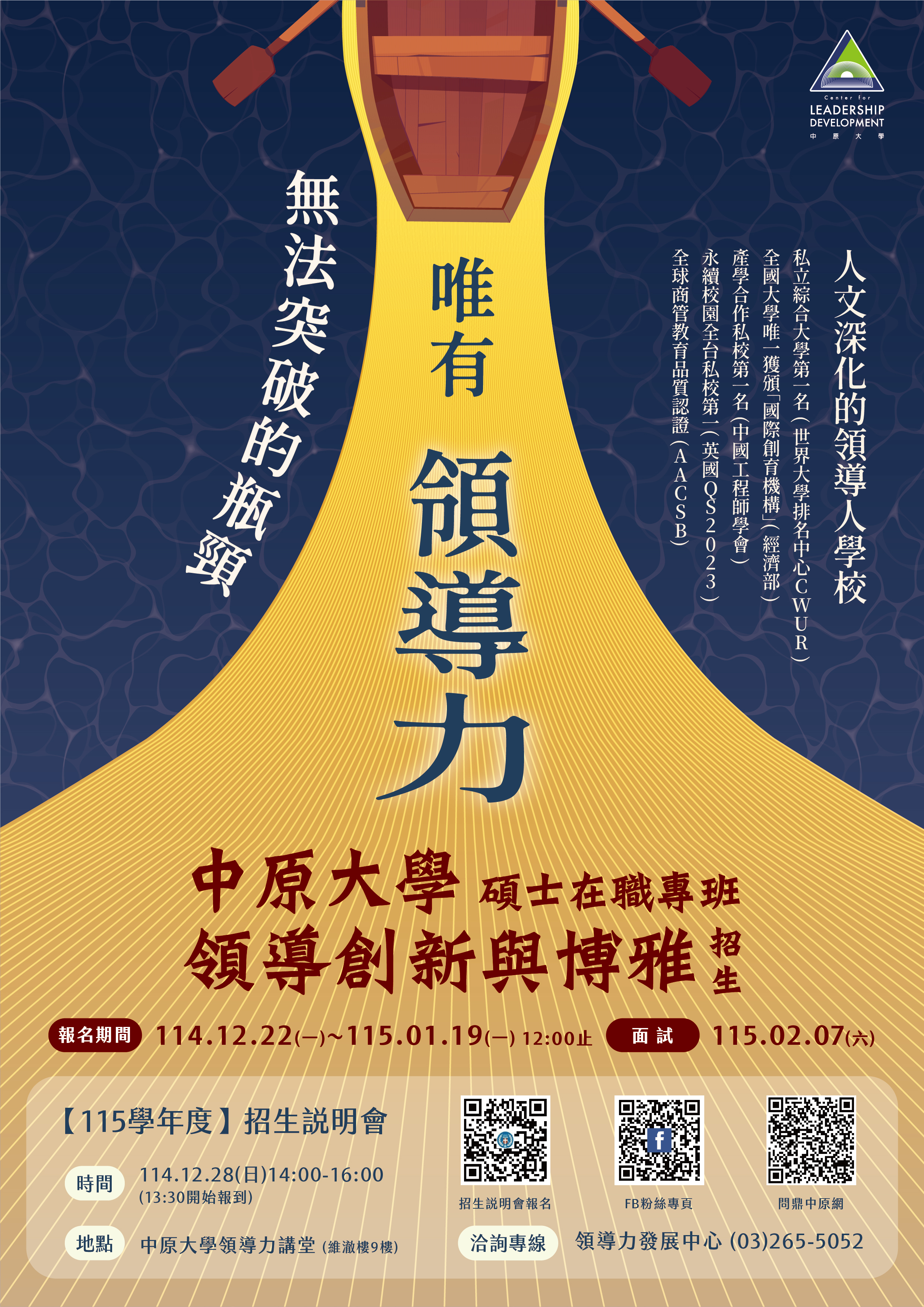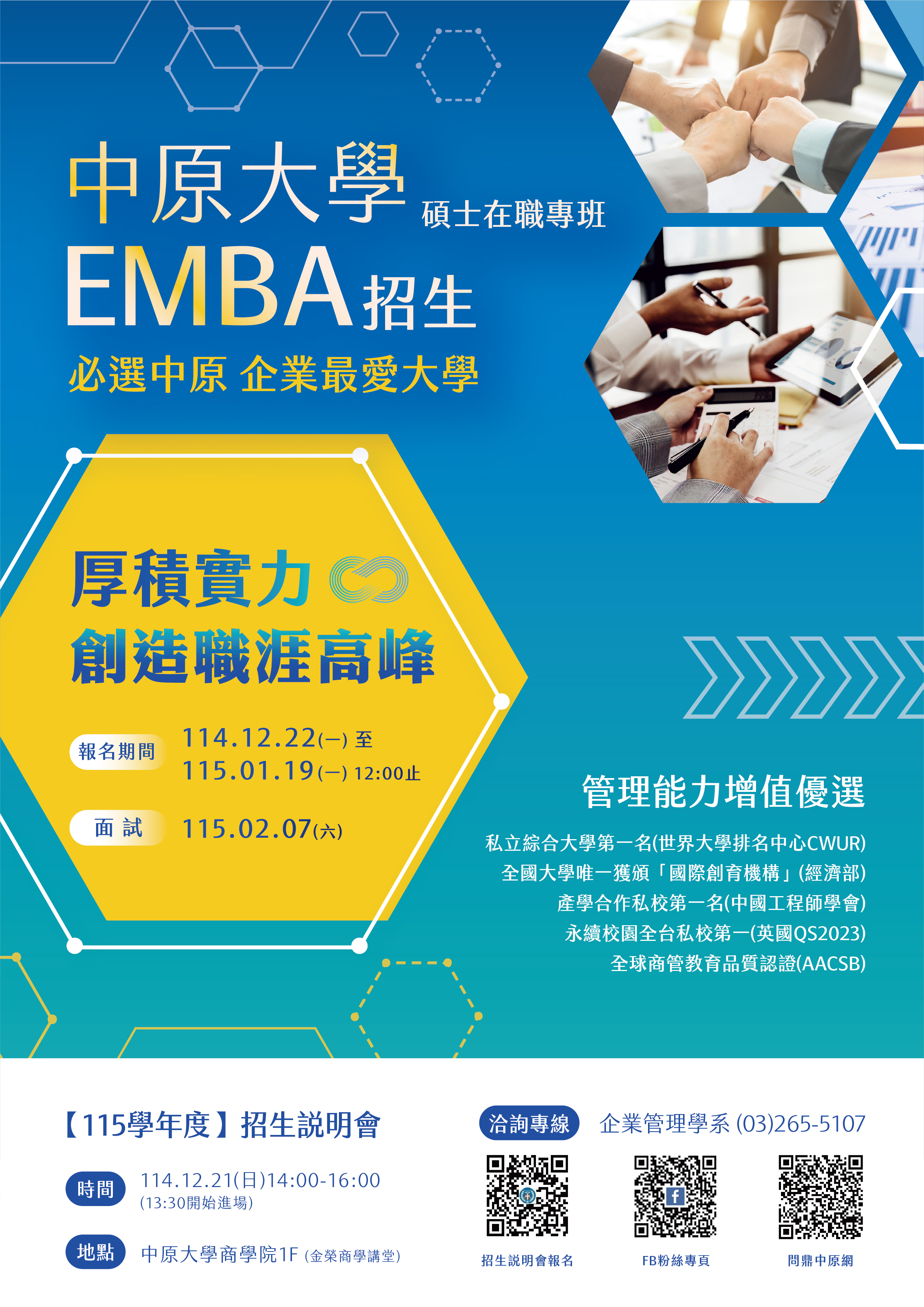 | 公告主旨 | 中原大學115學年度企業管理學系碩士在職專班招生資訊 |