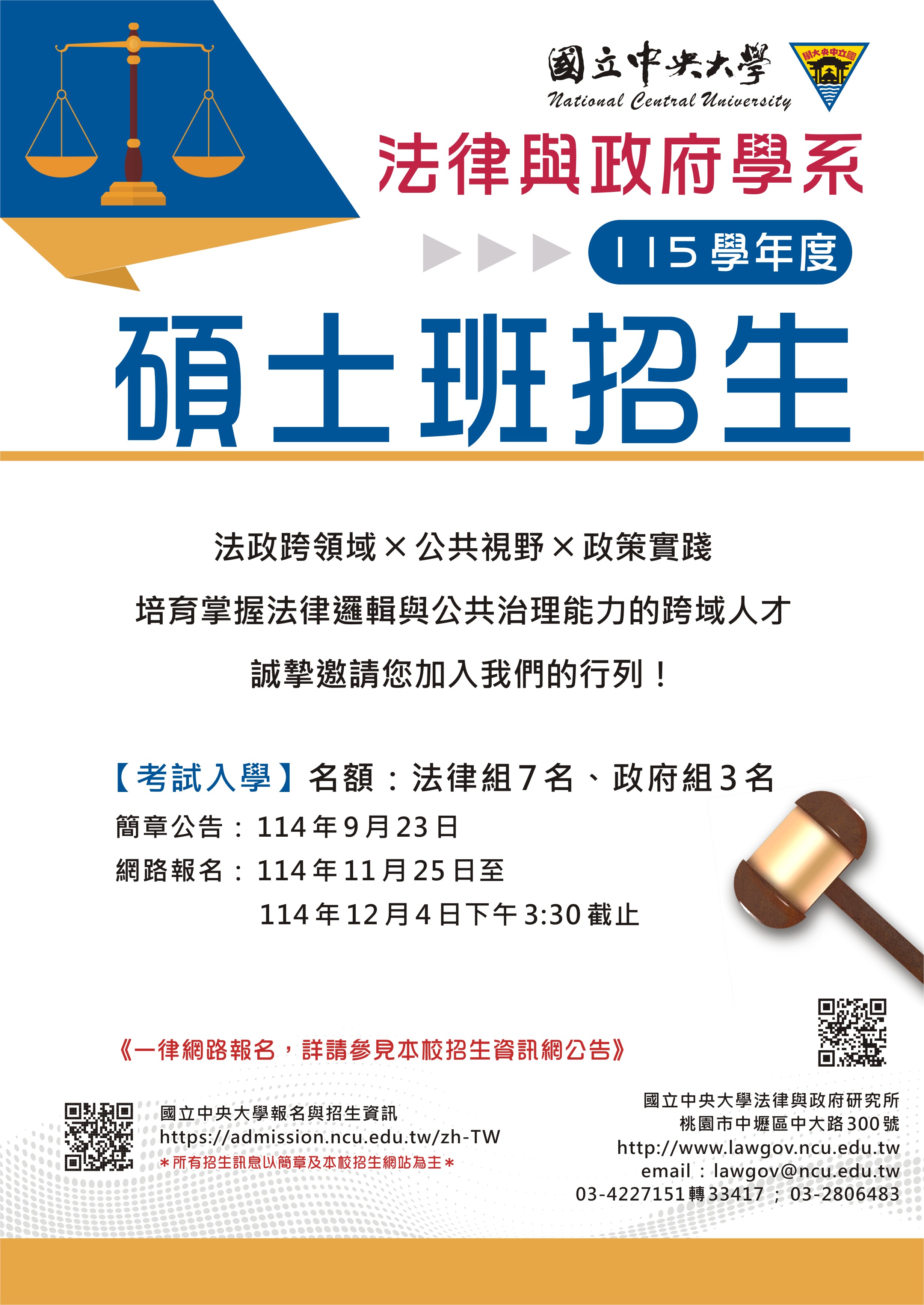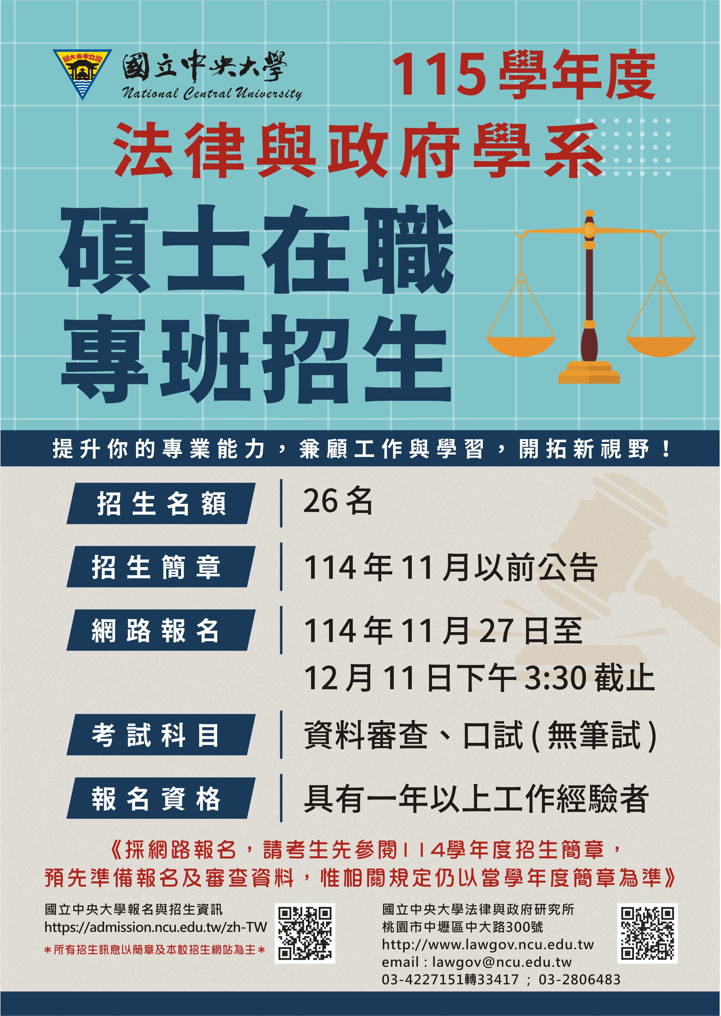 公告主旨 | 國立中央大學法律與政府學系「碩士班及碩士在職專班」115學年度招生資訊 |
