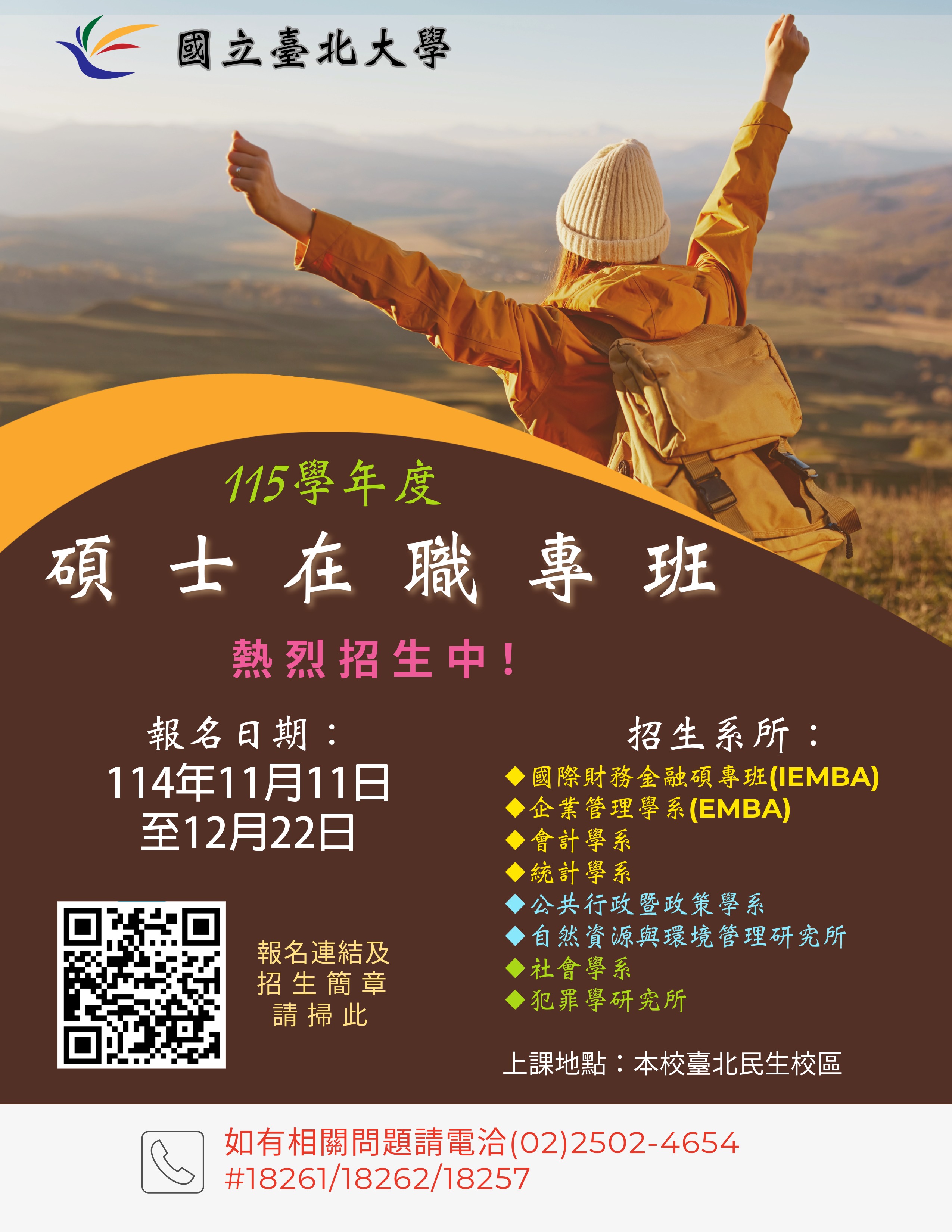 | 公告主旨 | 國立臺北大學115學年度碩士在職專班招生簡章 |