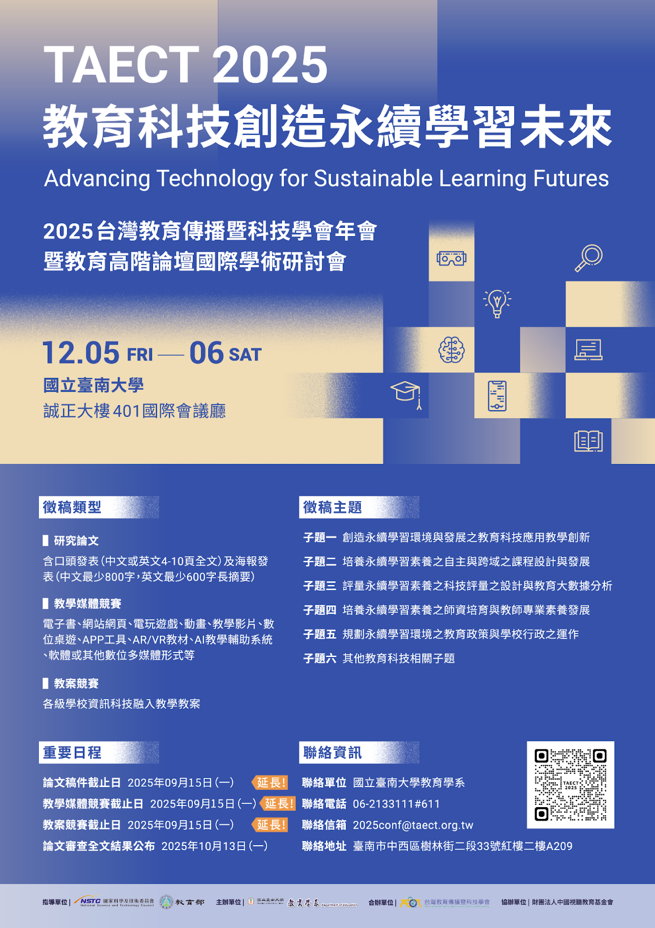 | 公告主旨 | 國立臺南大學教育學系辦理「2025 台灣教育傳播暨科技學會年會暨教育高階論壇國際學術研討會」延長截稿期限至114年9月15日止 |