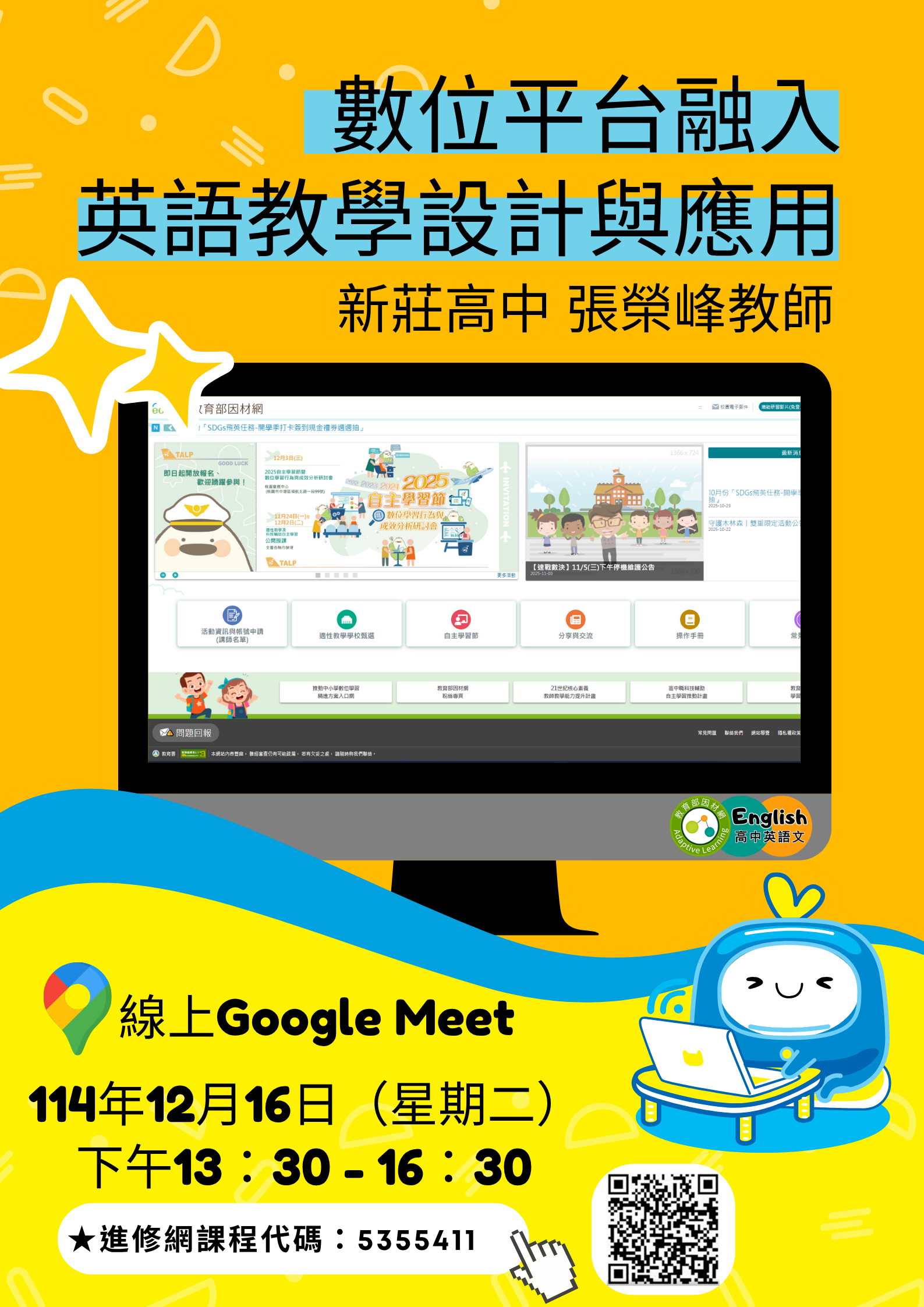 | 公告主旨 | 桃園市政府教育局函轉國立彰化師範大學辦理「高中英語文適性教學教材研發推廣計畫-教學應用推廣工作坊」 |