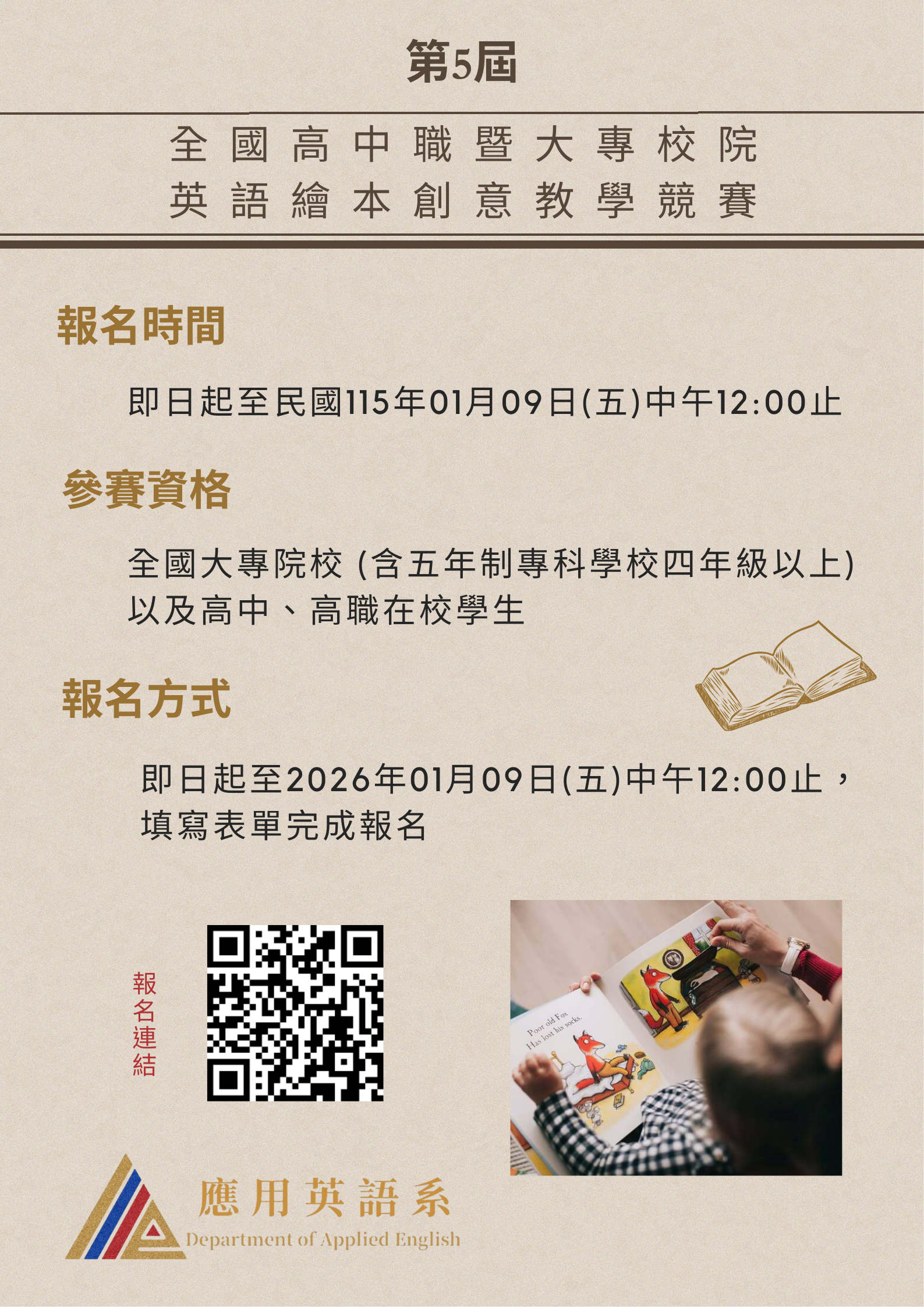 | 公告主旨 | 第5屆全國高中職暨大專校院英語繪本創意教學競賽 |