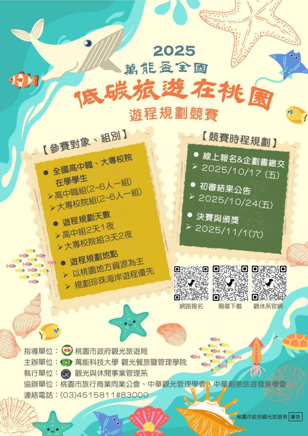 | 公告主旨 | 萬能學校財團法人萬能科技大學觀光與休閒事業管理系舉辦「2025萬能盃全國『低碳旅遊在桃園』遊程規劃競賽」 |