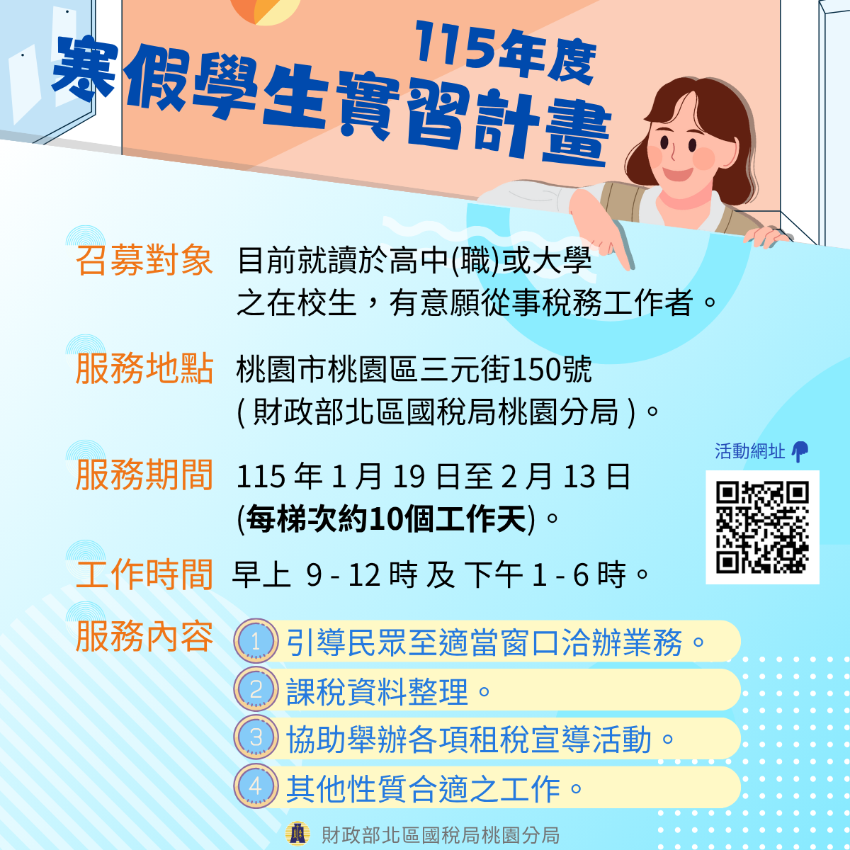 | 公告主旨 | 轉知~北區國稅局桃園分局寒假實習活動 |